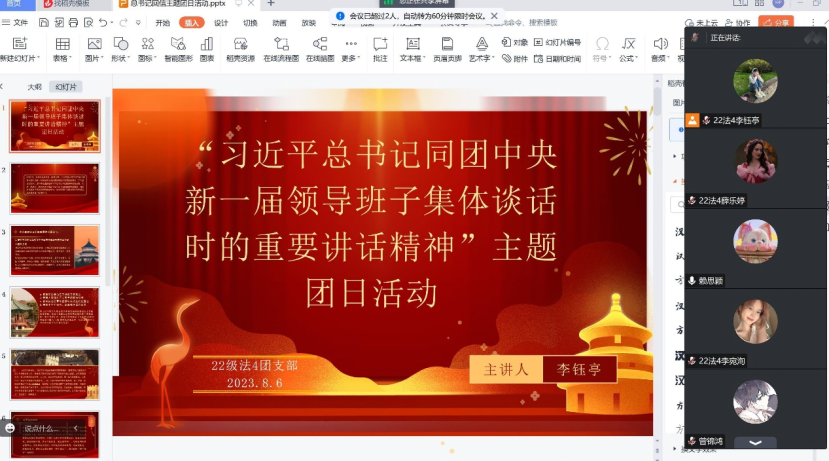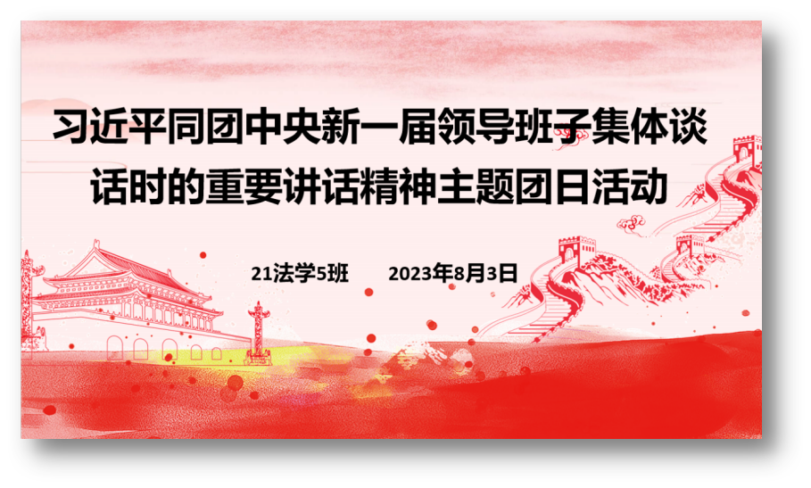 2023年6月26日,习近平总书记同团中央新一届领导班子成员集体谈话并发表重要讲话。为号召同学们领会习近平总书记的重要讲话精神,各班开展了“习近平总书记同团中央新一届领导班子集体谈话时的重要讲话精神”的主题团日活动。本次活动旨在引领动员广大团员青年切实肩负起新时代新征程的使命任务,在民族复兴伟业中接续奋斗。围绕习近平总书记的重要讲话精神,各班开展具有团支部特色的主题团日活动,增强了团员的使命感,激发了强国有我的激情,引导广大团员成长为有理想、有本领、有担当的时代新人,在中国式现代化建设中挺膺担当。