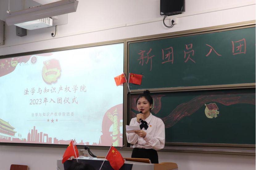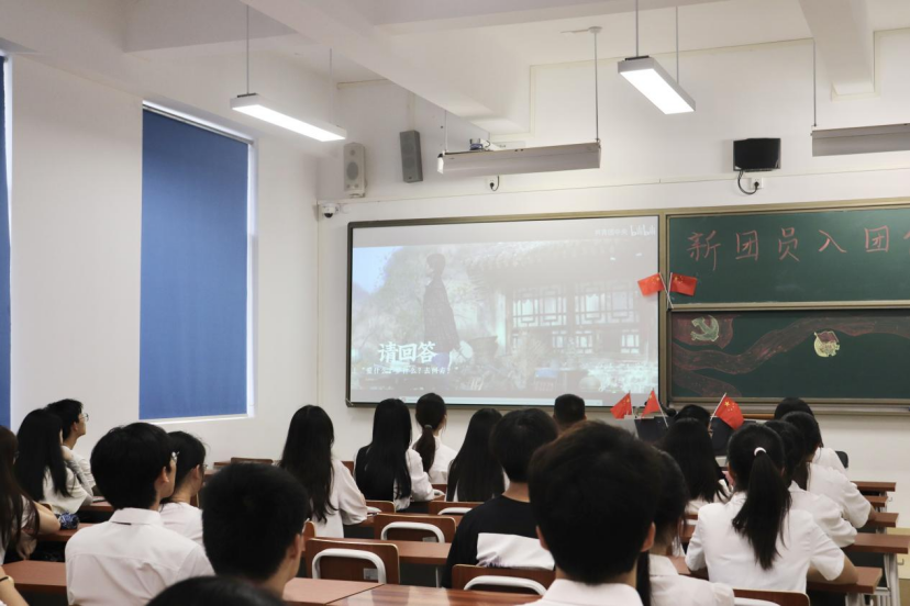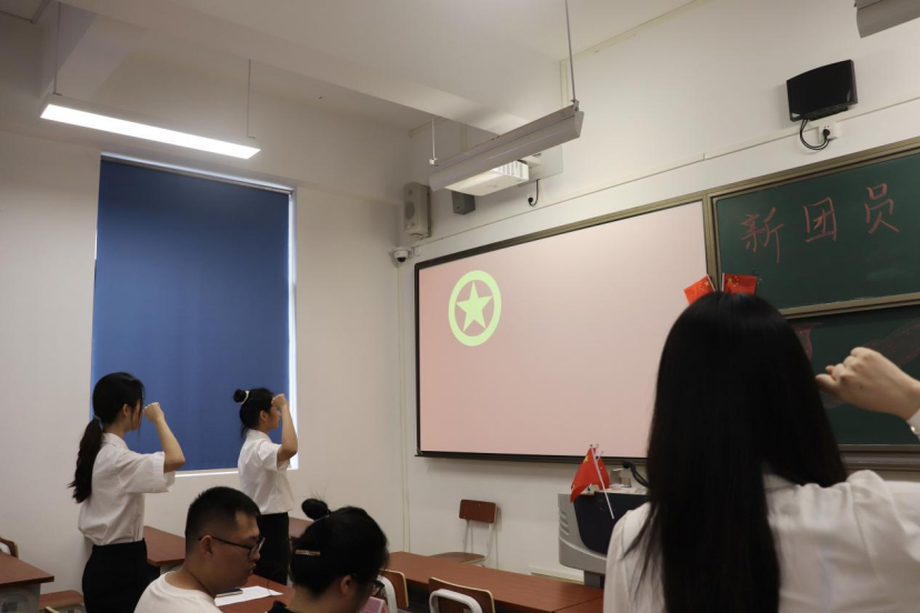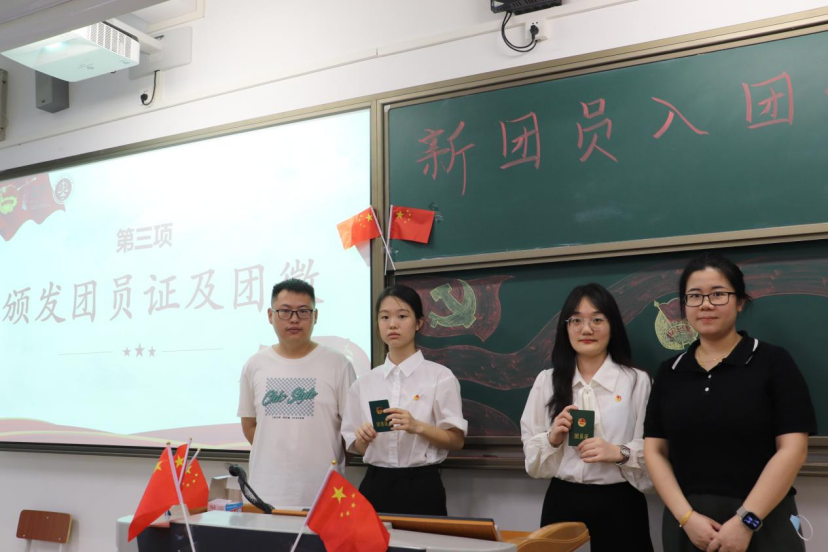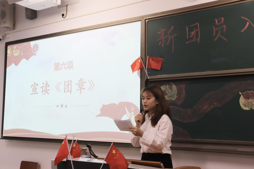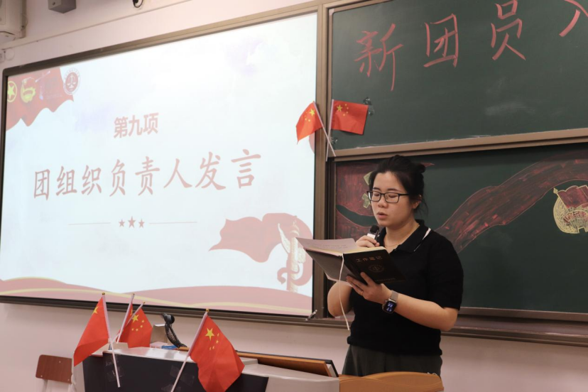 团组织负责人蓝雅婧老师指出,此次新团员考查尤为严格,经过层层筛选才使大家成为了一名光荣的共青团员。戴上团徽,是肩负责任的标志,是先进的标志。同时,蓝雅婧老师对新老团员提出四点要求:一是勤于学习,做有理想的时代青年。二是勇于负责,做敢担当的时代青年。三是能吃苦、肯奋斗,做有作为的时代青年。四是厚德博学善行,做知行合一的时代青年。最后,蓝雅婧老师寄语团员同学们继承和发扬五四精神,做一个有理想、有本领、有担当的社会主义建设者和接班人。
