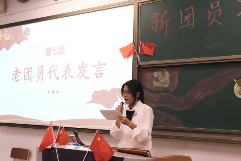 老团员代表梁伊伶同学发言,她向新一批入团的同学表示热烈的祝贺,同时也强调了共青团员的使命与担当。她寄予新团员们期望,希望新团员在团组织的领导下,怀抱梦想又脚踏实地、虚心学习、不断进取,做有理想、敢担当、能吃苦、肯奋斗的新时代好青年,为团组织的活动和工作不断增辉添色!