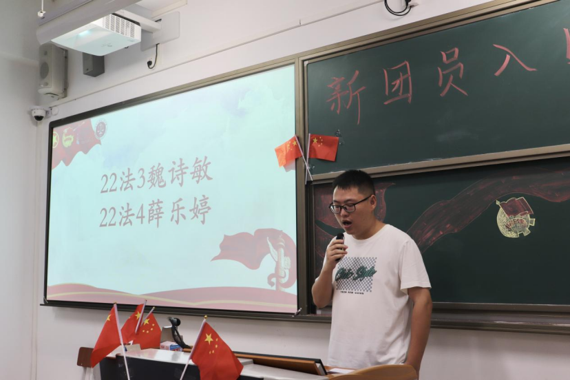 辅导员王嘉晨老师宣读新团员名单,本年度共有2名22级同学被光荣地批准加入共青团。