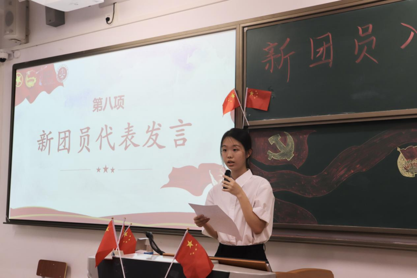 新团员代表魏诗敏同学发言,她表示加入共青团是团员崭新的起点,而不是奋斗的终点。在新时代,我们肩负着重大的历史使命,未来的社会更需要千千万万有理想、有道德、有文化、有纪律的优秀青年。为此,她代表新团员们郑重承诺:将继承和发扬共青团的优良传统,以团员的标准严格要求自己,刻苦学习,努力奋斗,为祖国贡献自己的每一份力量,用实际行动践行自己的入团誓言!