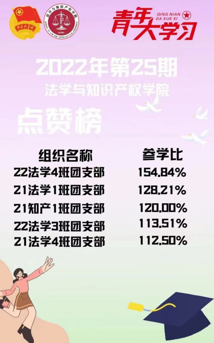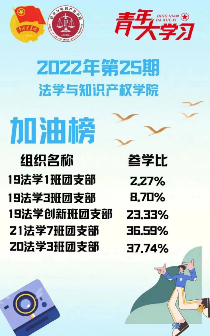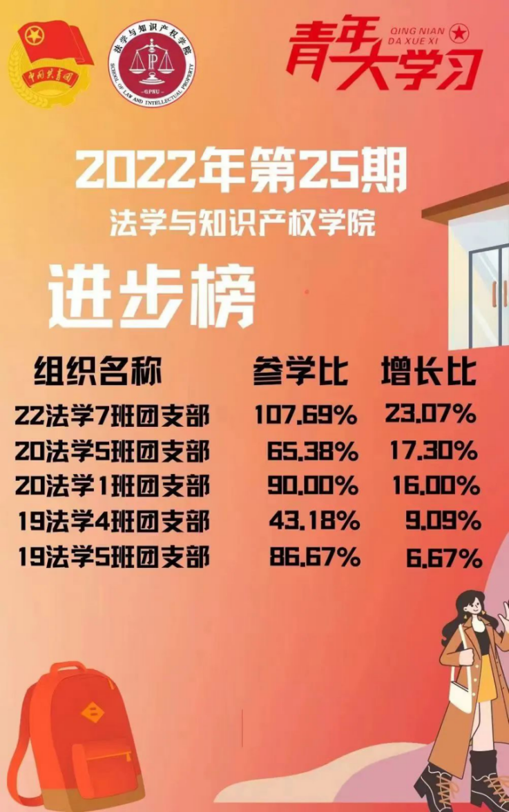 从各基层组织的课程学习情况来看,我院22级法学3班、4班团支部,21级法学1班、4班团支部,21级知产1班团支部的参学比均达到110%以上,值得表扬!此外,19级法学4班、5班团支部、20级法学1班、5班团支部、22级法学7班团支部增长比均达到了5%以上,参学的情绪高涨!最后希望参学比不足50%的班级团支部向优秀的班级团支部看齐,提高学习的热情。