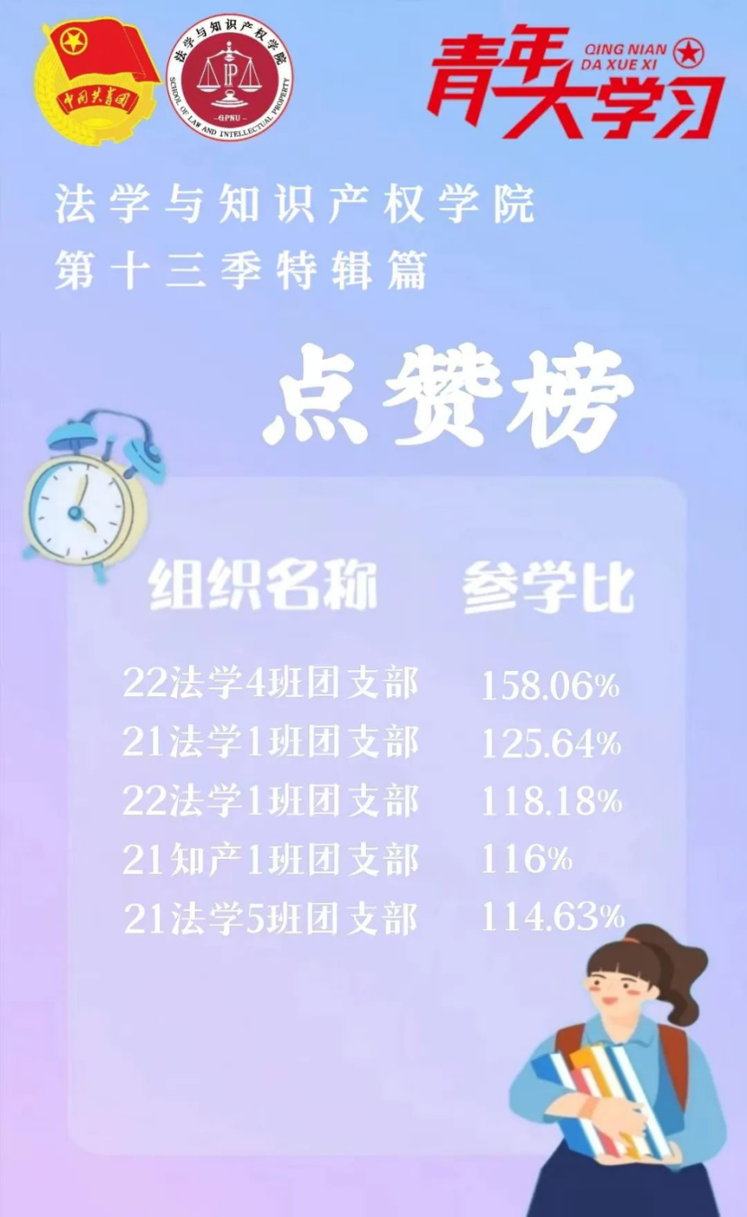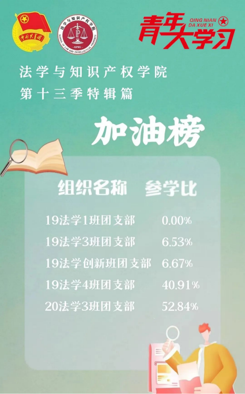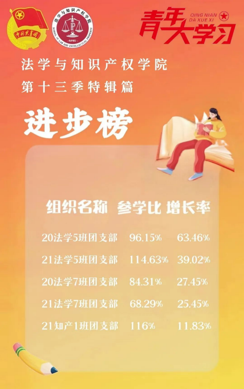 从各基层组织的课程学习情况来看,我院21级法学1班、5班、知产1班团支部、22级法学4班、1班团支部的参学比均达到110%及以上,值得表扬!此外,20级法学5班、7班团支部、21级法5班、7班和21级知产1班团支部的参学增长比均达到了10%以上,参学的情绪高涨!最后希望参学比不足50%的班级团支部向优秀的班级团支部看齐,提高学习的热情。