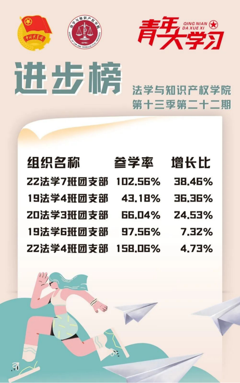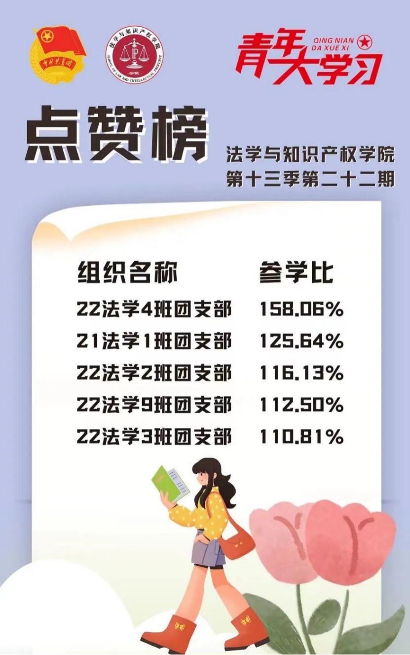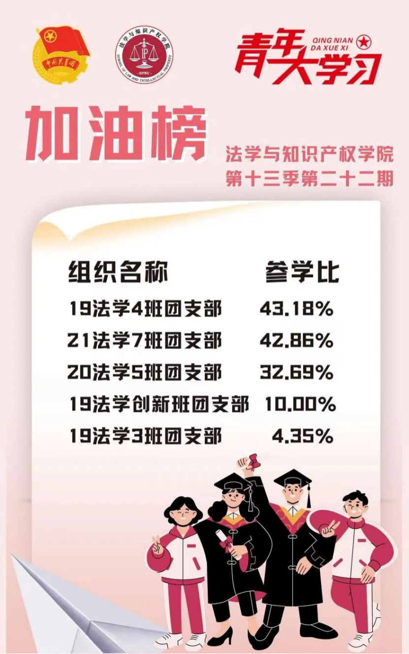 从各基层组织的课程学习情况来看,我院22级法学4班、2班、9班、3班团支部和21级法学1班团支部的参学比均达到110%及以上,希望下期继续保持较高的发动效率,延续此前好成绩!此外,22级法学7班、4班团支部、20级法学3班团支部和19级法学4班、6班团支部的参学增长比均达到了4%以上,参学的情绪高涨!最后希望参学比不足50%的班级团支部在下一期有新的提高和突破。