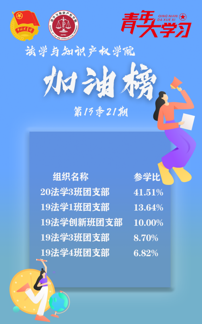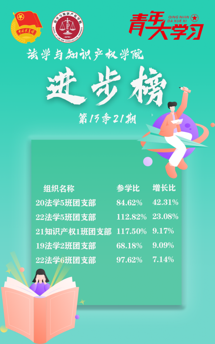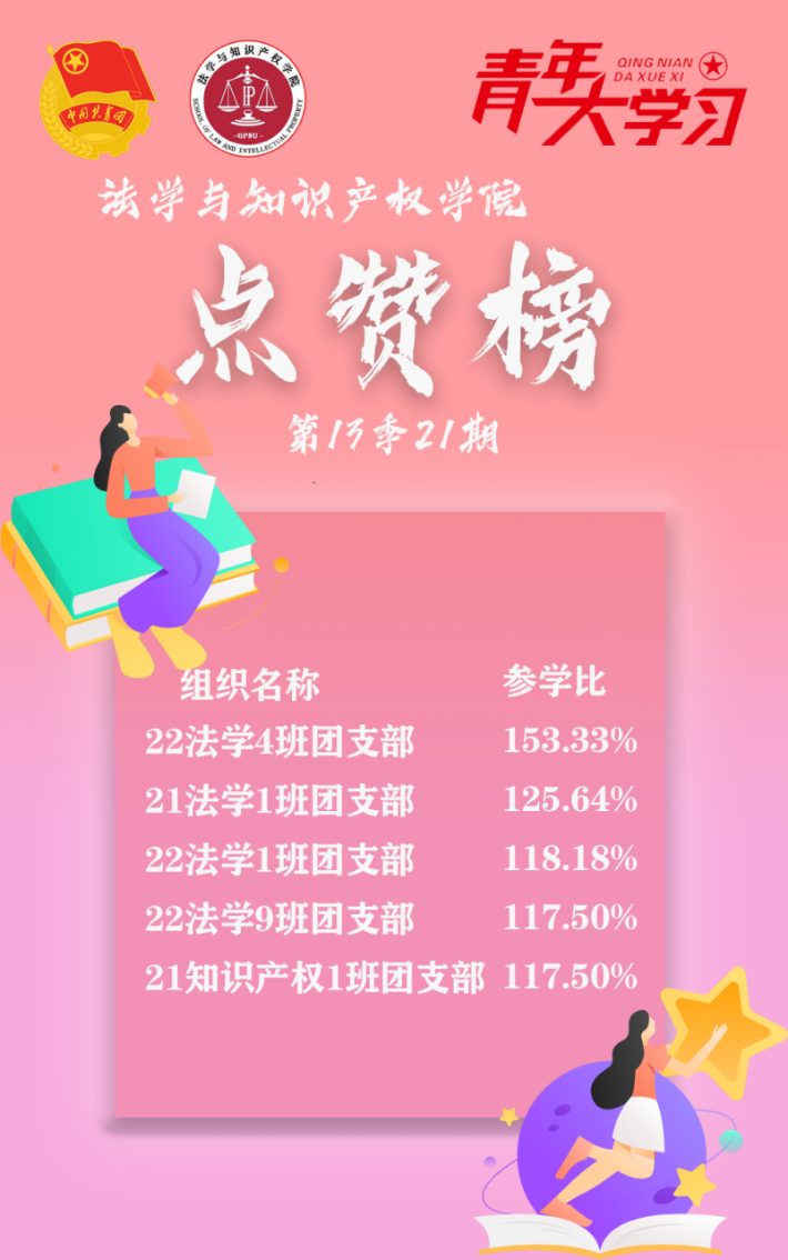 从各基层组织的课程学习情况来看,我院22法学4班、1班、9班团支部、21法学1班、知识产权1班团支部的参学成绩优异,是各团支部学习的优秀榜样!同时,20法学5班团支部、22法学5班、6班团支部、21知识产权1班团支部以及19法学2班团支部的参学积极性也有所提高。