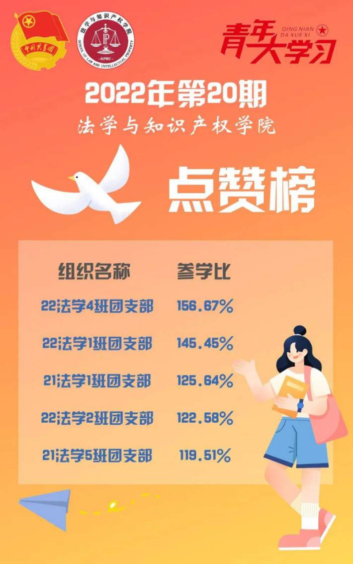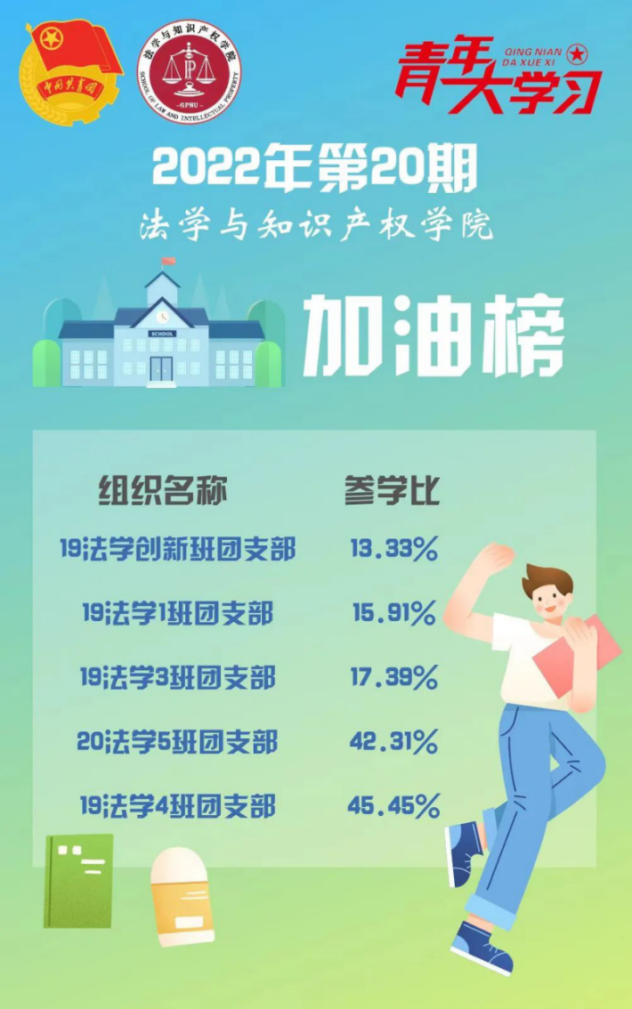 从各基层组织本周的课程学习情况来看,我院22级法学1班、2班、4班团支部,21级法学1班、5班团支部的参学情况优异,是各团支部优秀的学习榜样!