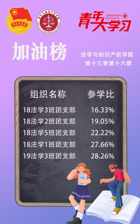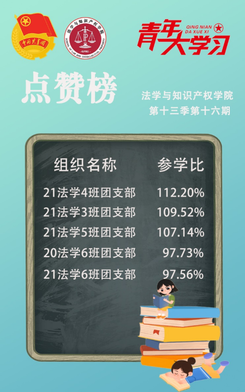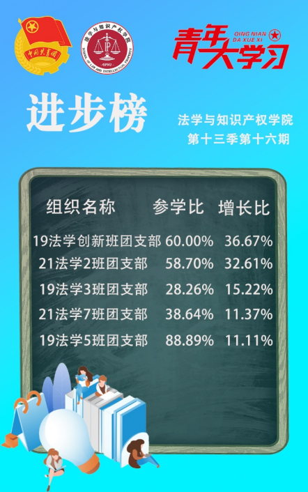 从各基层组织的课程学习情况来看,我院21法学4班、3班、5班团支部,20法学6班团支部和21法学6班团支部的参学成绩优异,是各团支部学习的优秀榜样!同时,19法学创新班团支部、21法学2班团支部、19法学3班团支部、21法学7班团支部和19法学5班团支部的参学积极性也有所提高。最后,希望各团支部继续积极动员团员青年参与学习,持续掀起学习热情,让团员青年更好地学习党的理论!