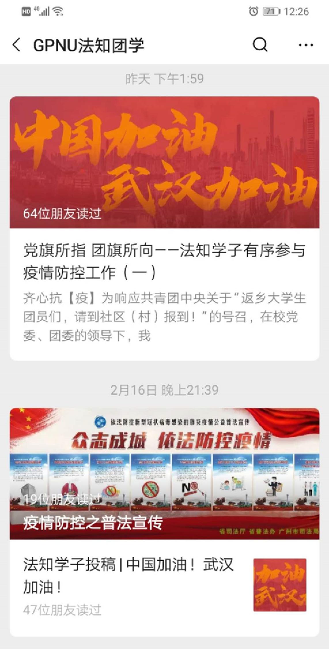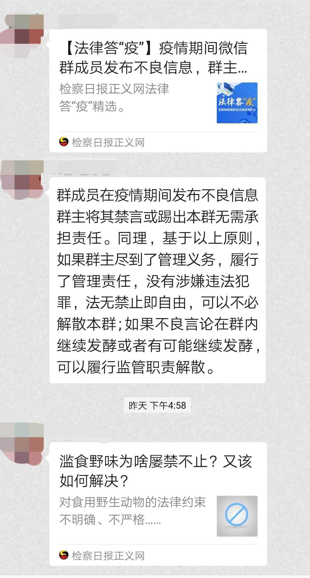 我是法学专业的学生,是我们学院法律服务中心的一员,我每天参与着法律咨询群的普法工作,我转的发的大多数推文,也和这次疫情息息相关,内容从疫情防控措施到涉疫罪行,从针对疫情的新型诈骗再到保护自身的合法权益。我在普及法律知识的同时也提醒他人遵守法律、对于侵害自身、他人、社会利益的违法行为可用于举报。国家身处疫情的漩涡之中,我不是逆行的勇士,但也想贡献自己的一份力量。