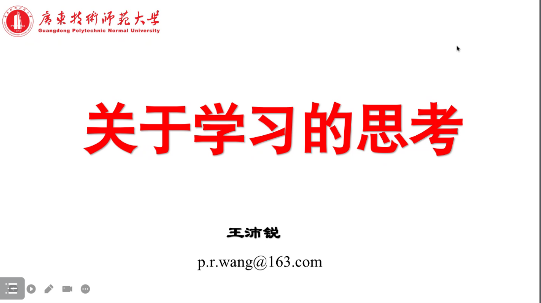 王沛锐老师从关于学习的思考角度展开,向同学们分享自己的本科学习生活,拉近与同学们的距离,建议同学们找到一个快感与痛感的平衡,将学习作为一种快乐。接着从如何找到学习的乐趣给出四种方法:第一,寻找一个喜欢的、感兴趣的研究方向;第二,集中注意力,全神贯注学习,排除干扰;第三,即时的反馈,给自己定一个小目标;第四,沉浸于忘我的学习状态中。希望同学们能够在学习中找到乐趣,快乐学习。