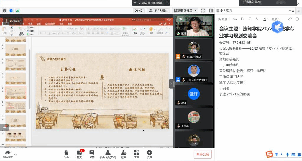于钧泓老师着重讲述当前考研相关情况,她从近年报考概况与形式、法学考研和留学择校、法学考研技能提升方面、法学考研的日常关注要点和法学考研的备考要点等五个方面进行展开讲述。针对当前考研竞争激烈,她建议在大学初期,应寻找适合自己的学习方法,需要重视专业课和外语成绩,多关注考研动向并且尽早准备,毕竟机会是留给有准备的人。