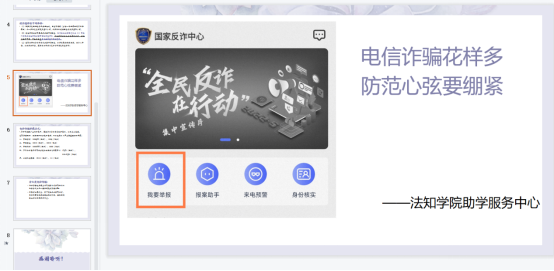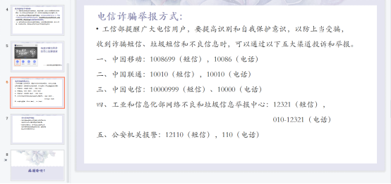 助学助理分别从电信诈骗的定义、电信诈骗的类型、防范电信诈骗的方法等方面向同学们普及了谨防电信诈骗的相关知识,蓝老师随后也针对电信诈骗的问题对同学们发出呼吁:我们在自觉提高自身防范电信网络诈骗能力的同时,还要主动担负社会责任,做好防骗反诈宣传员,将防骗反诈知识传递给身边的每一个人,让更多人了解如何识别防范电信网络诈骗,避免上当受骗。