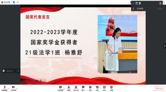 随后是国家奖学金获得者代表发言。21级法学1班的杨雅舒向同学们阐述了资助政策的重要性,鼓励同学们善于利用这些资源助力自身的成长,她还从专业学习、学科竞赛、实践活动等方面详细地向大家介绍了自己的经验。