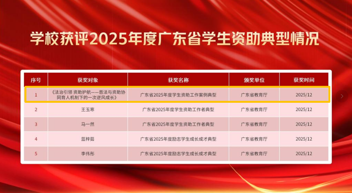 近日,广东省教育厅公布2025年度学生资助典型评审结果。在学校获评的五项资助育人项目中,我院辅导员李佩文撰写的《法治引领资助护航——普法与资助协同育人机制下的一次逆风成长》案例,成功获评“广东省2025年度学生资助工作案例典型”。这是我院持续推进“三全育人”、深化资助工作内涵建设取得的又一重要成果。