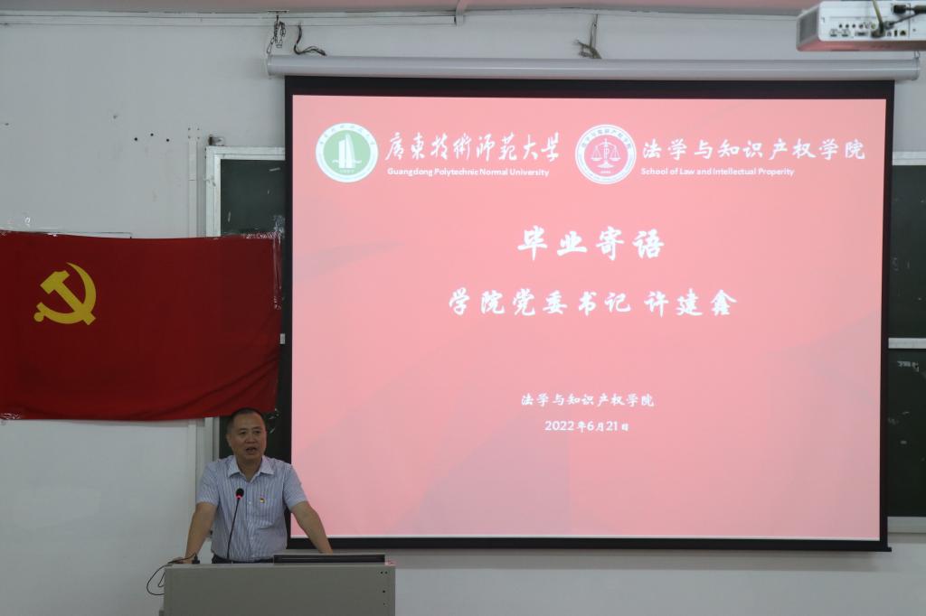 第四项,毕业寄语环节,许建鑫代表学院对2022届毕业生顺利毕业表示祝贺,为全体2022届毕业生党员进行廉政党课教育,并对全体党员提出四点希望与要求:以合格党员标准严格要求自己,严格遵守党章、党纪、党规,严格遵守宪法和法律,自觉践行社会主义核心价值观;保持积极、向上、阳光和清醒的头脑,牢固树立红线意识、底线思维和法治意识,真好廉洁人生路;认真学习习近平新时代中国特色社会主义思想和党的创新理论,坚定理想信念;继续学会做人学会做事,认真学习、积极奋斗,努力跑出当代青年最好的成绩。最后,他祝愿同学们万事如意,前程似锦,并希望各位毕业生党员带头心系母校,常回家看看!