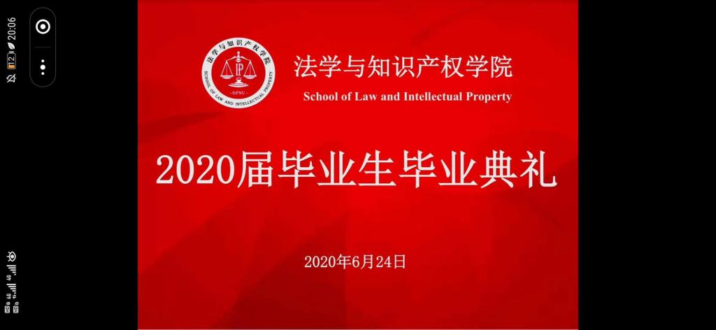 在毕业典礼上,播放了精心为毕业生制作的视频,内容从新生入学报到、军训阅兵到备战法考、疫情期间的线上党团日。2020届毕业生是学校跨越式发展的见证者和参与者,亲历了学校60周年校庆的盛大庆典、更名广师大的揭幕仪式、河源校区的动工建设、第一届党代会的胜利召开……视频从照片收集、撰写文案到最终呈现,倾注了师生的浓浓深情。