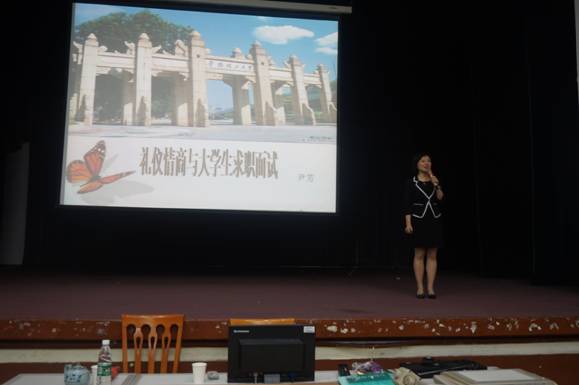 11月9日晚7点,华南理工大学经贸培训中心副主任尹芳老师应邀来我院作主题为《礼仪情商与大学生求职面试》的就业讲座。政法学院党委陈军副书记、辅导员赵利老师以及600多名学生认真聆听了讲座。