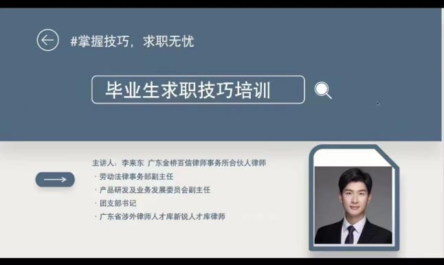 为帮助毕业生解决求职过程中遇到的困难和问题,促进毕业生更充分就业。我院于422日举办“识面试之巧 ‘职’冲云霄”求职面试技巧经验分享会,邀请了广东金桥百信律师事务所李来东校友线上分享,2024届毕业生积极报名参会。