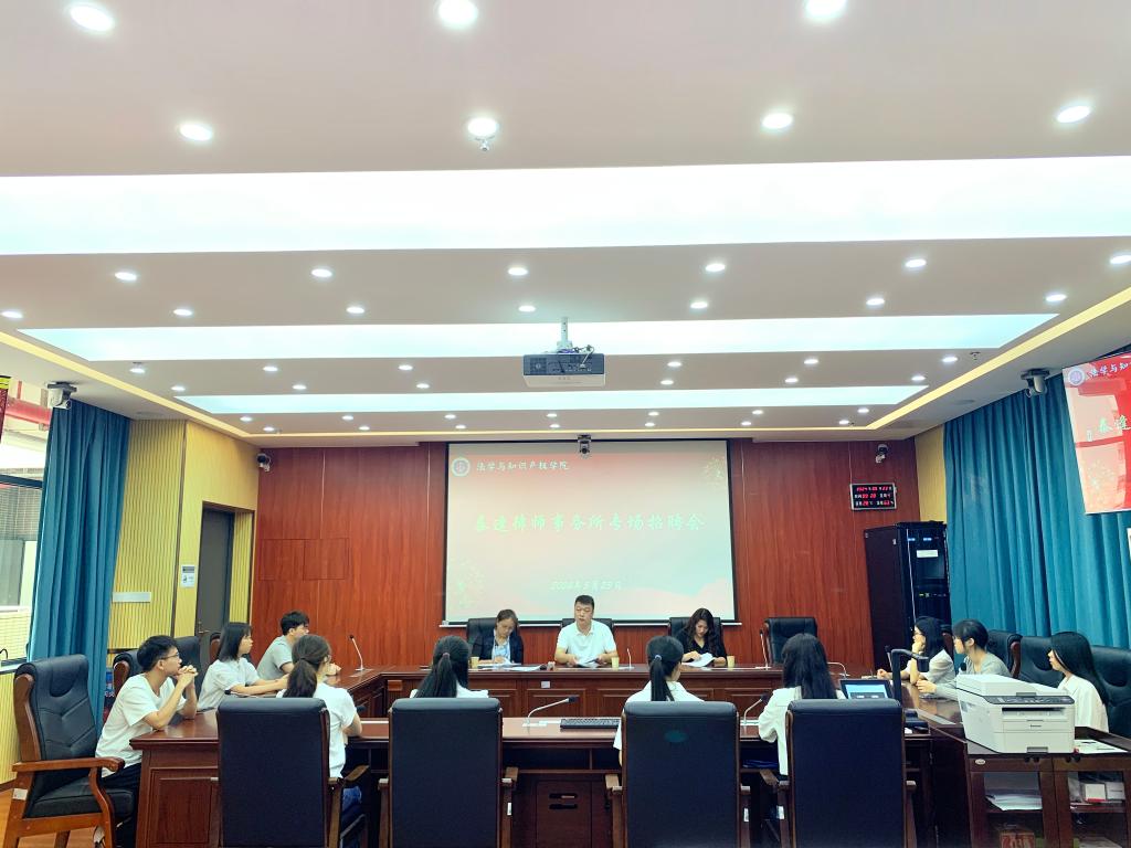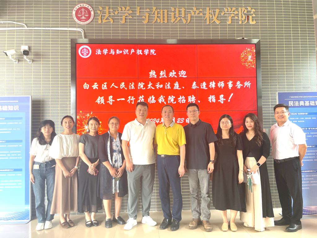 为进一步推进校地共建合作,并强化供需市场衔接,开展访企拓岗交流,5月23日,我院邀请广州市白云区人民法院太和法庭、广东泰逢律师事务所来白云校区开展交流座谈和举办专场招聘会。太和法庭副庭长罗炜、潘静法官,泰逢律师事务所主任张德欣、柴宝玲律师和相关工作人员曾婉萍、庄敏玲,学院党委书记许建鑫,法律系主任万娟娟、副主任朱腾伟,知识产权系党支部书记、主任林蔚,辅导员梁嘉乐和15名有意从事律师实务的同学参加招聘会。