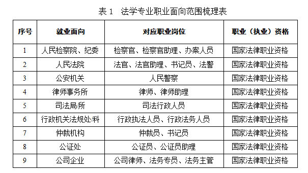 表1 法学专业职业面向范围梳理表