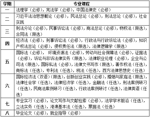 法学专业的专业课程分布于8个学期之间,含必修课、限选课、任选课。