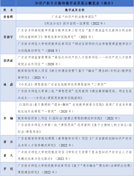 广东技术师范大学作为一所具有硕士学位授予权的省属普通高等学校,致力于打造中国“双师型”职教师资培养的南方高地、服务产业转型升级重大战略需求,旨在为社会发展培养应用型、实践性人才。知识产权专业立足于学校的发展定位,积极融入学校发展,致力于培养粤港澳大湾区应用型、复合型知识产权法律人才。