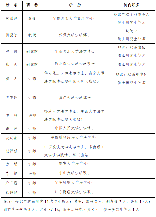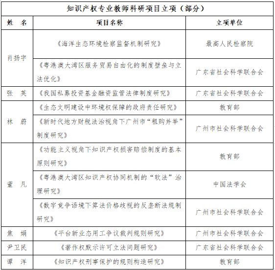 近年来,知识产权专业教师出版著书2部,公开发表论文60余篇,其中34篇发表于CSSCI来源期刊(包括集刊),部分为人大复印资料全文转载;专业教师共主持科研课题26项,其中省部级项目11项,占比42.3%;参与广东地级市起草地方立法条例、法规8项。