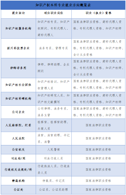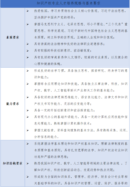 知识产权专业(030102T)基本学制为四年,培养方案总学分为163学分,核心课程采取“1+10+X”分类设置模式,授予法学学士学位。在课程设置方面,除专业主干课程之外,突出应用类课程和法律职业技能实训课程,旨在培养学生具有扎实的知识产权法学知识储备、较强的法律应用能力和娴熟的法律职业技能;知识产权专业融合人文社科和自然科学知识元素,加强创新思维训练;知识产权专业主要为社会培养能系统掌握法学基础知识、具有较强的知识产权理论素养和实务操作能力的复合型人才。知识产权专业毕业生适合在国家立法机关、审判机关、检察机关、大型企业、律师事务所以及专利商标事务等知识产权中介服务机构中从事与知识产权相关的工作。