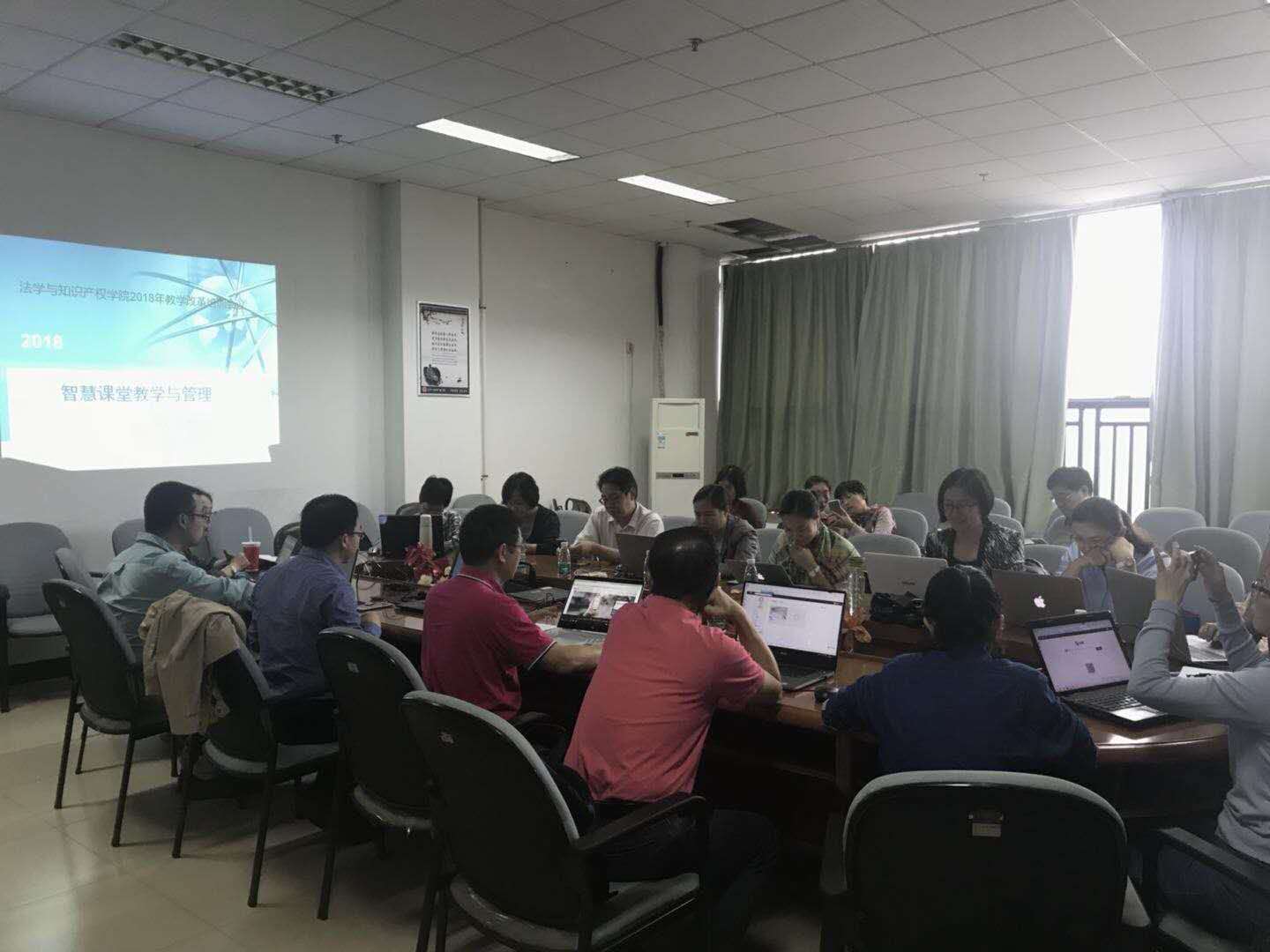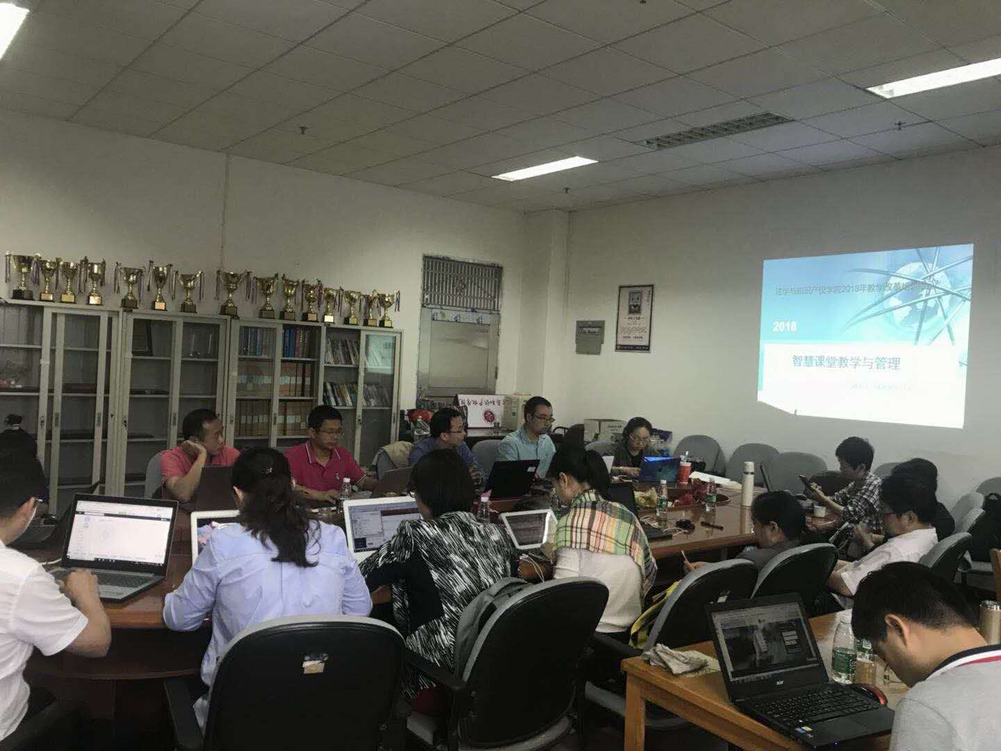 为此,我院于4月26日下午组织全体教师在第一教学楼317会议室举行了智慧课堂建设与教学改革首场内部培训会。本次培训会先由于定勇副院长就移动端教学工具“超星学习通”进行使用心得与经验分享。然后由于副院长带领全体教师进行实操。通过实操,大家基本知道如何注册、如何建立自己的课程和班级、如何开展线上的各种活动、如何利用该软件进行签到管理、课程评价管理等等。