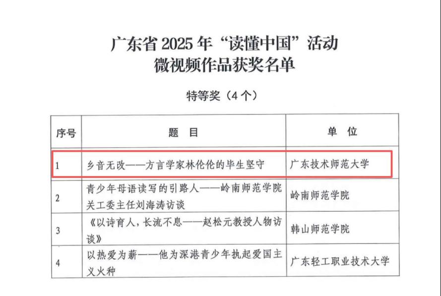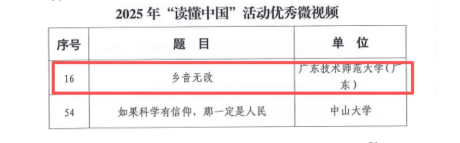 近日,教育部关工委公布2025年“读懂中国”活动评选结果。在学校关工委指导下,我院与教育科学学院联合报送的微视频《乡音无改》(作者:马堆溶、甘伟焯、贾智麟,指导老师:李佩文、陈军)荣获全国“优秀微视频”。本次活动以“弘扬时代精神,建设教育强国”为主题,我院关工委积极响应,充分发挥组织协调作用,广泛动员师生参与。