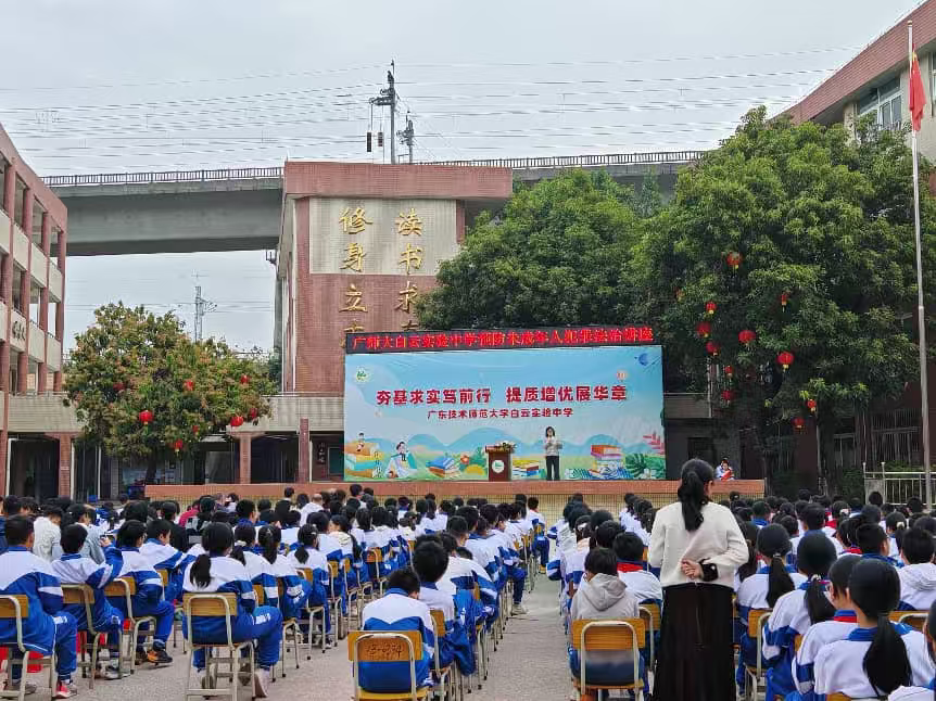 1月30日上午,广东技术师范大学白云实验中学邀请我院付文佚副教授,为全校1200余名师生开展了一场主题为《学习法律常识 预防霸凌诈骗》的法治教育宣讲。活动由该校副校长徐敬恩主持。